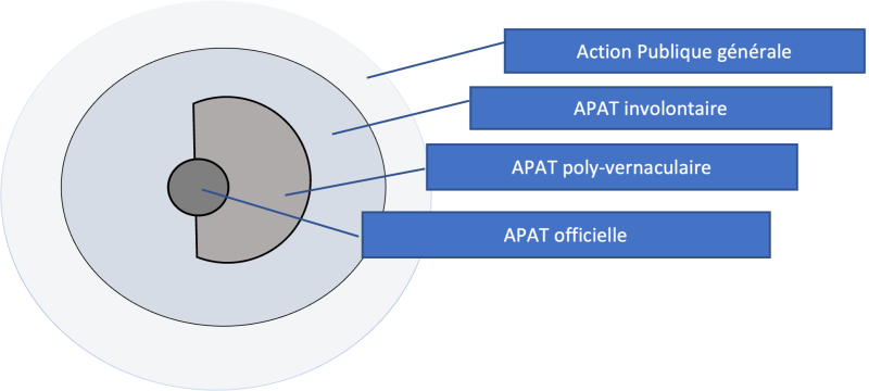 Comme on vient tout juste de le voir, l’APATOF, l’action publique officielle, monopolisée par quelques propriétaires étatiques (État, police de renseignement, justice spécialisée), n’a pas le monopole d’une action publique anti-terroriste efficace. Nous avons ainsi pu en découvrir deux autres types tout aussi importants qui sont malheureusement peu pris en compte dans l’analyse des politiques publiques antiterroristes. Il s’agit de l’APAT poly-vernaculaire (APATVER) et de l’APAT involontaire (APATINV). Ces acronymes n’ont pas d’autres fonctions qu’acronymiques : pour en faciliter l’appropriation par le lecteur, nous proposons le schéma ci-dessous.