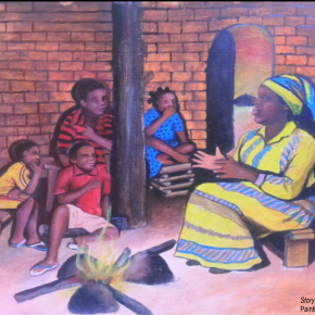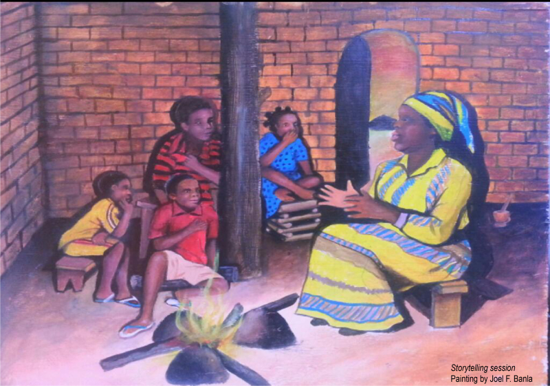 Storytelling session. Painting by Joel F. Banla