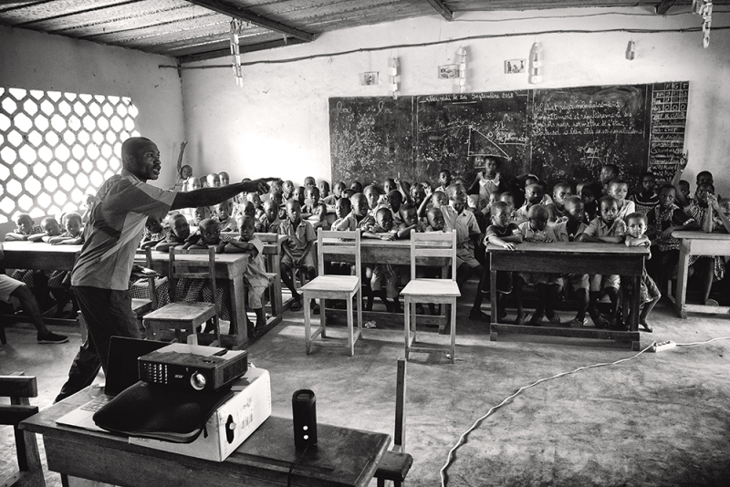 Dans une école du village d’Aghien-Télégraphe, près d’Abidjan en Côte d’Ivoire, cet instituteur échange avec ses élèves sur la protection des ressources naturelles qui leur sont proches.